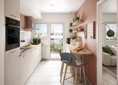 Les surfaces stratifiées affichent aujourd'hui un excellent rapport qualité prix. Elles imitent le bois, la pierre ou le béton, résistent bien aux chocs et à l'humidité et se nettoient facilement, ce qui convient parfaitement à une cuisine très utilisée.