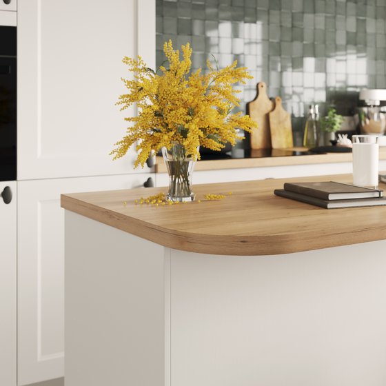L’îlot aux angles arrondis est un atout de taille pour une famille avec enfants : pas de risque de se cogner dans les coins ! Et parce que le pratique ne doit jamais faire oublier l’esthétique, l’îlot apporte à cette cuisine une touche de style et d’élégance.