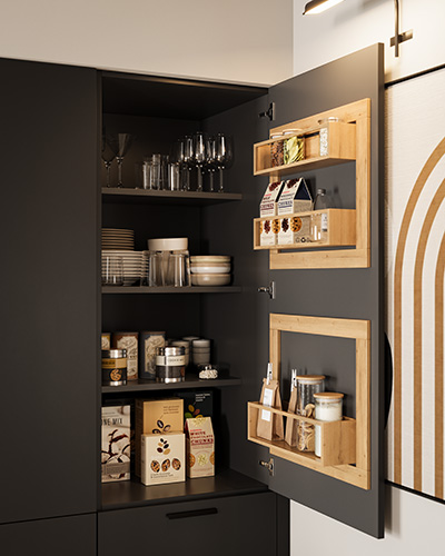 Optimisez chaque centimètre avec ces étagères intelligemment intégrées à la porte. Parfaites pour garder à portée de main épices, sachets, condiments ou petites provisions du quotidien, elles offrent un rangement fonctionnel et esthétique, sans encombrer l’intérieur du meuble.