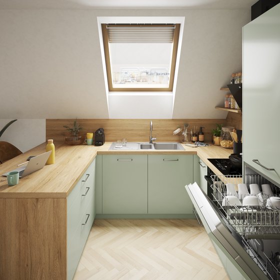Petite, oui, mais surtout pratique et cosy ! Avec ses teintes vert jade, cette cuisine vous apportera apaisement et douceur. Sa configuration permet de délimiter les espaces intelligemment. Et si vous le souhaitez, vous pouvez prolonger ce joli vert jusqu'à vos meubles de salon, pour un effet zen assuré.