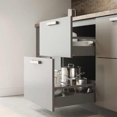 On évite le tiroir à couvert sous la taque de cuisson pour récupérer de la hauteur et glisser dans les armoires nos grandes casseroles.