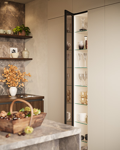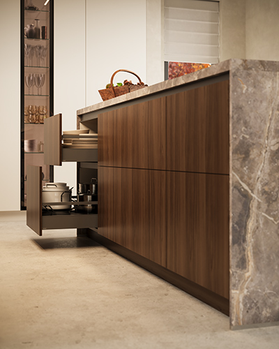 Pour préserver la pureté des lignes, les coulissants inférieurs adoptent un système push-to-open, permettant de se passer de poignées visibles. Une seule gorge discrète structure l’ensemble et accentue l’esthétique minimaliste de l’îlot, tout en garantissant un confort d’utilisation optimal.
