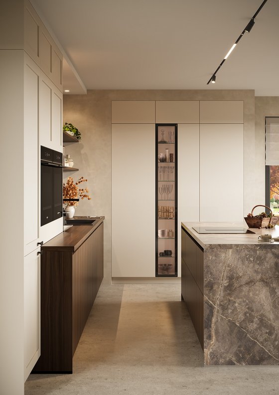 Mariage délicat entre finesse et tempérament, la Linea Élégante joue sur les contrastes avec élégance. Les façades à cadre dialoguent avec la pureté des surfaces lisses, dans une teinte sable fin, douce et intemporelle. Ce ton lumineux s’accorde à merveille avec la chaleur du noyer et le raffinement d’un plan de travail effet marbre, pour une composition à la fois moderne et sophistiquée.