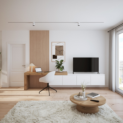 Le meuble TV joue les prolongations et se transforme en bureau. Parfait pour travailler… ou pour enchaîner les épisodes de votre série préférée ! Meuble sur mesure. Prolongation du meuble TV en bureau, idéal pour le télétravail.