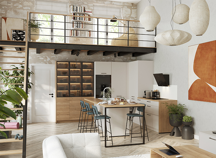 Sa neutralité lumineuse en fait un fond idéal pour jouer avec les matières. Associé à du bois clair, il crée une ambiance chaleureuse et organique. Avec un plan de travail en marbre blanc veiné, il gagne en élégance sans ostentation. Relevé de touches de noir mat — robinetterie, poignées, hotte — il acquiert du caractère et de la profondeur. Et entouré de plantes, il devient la toile parfaite d’un intérieur vivant.