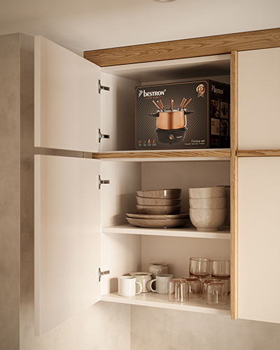 Ce meuble haut qui allie capacité et élégance, accueille avec discrétion vos appareils du quotidien.