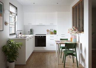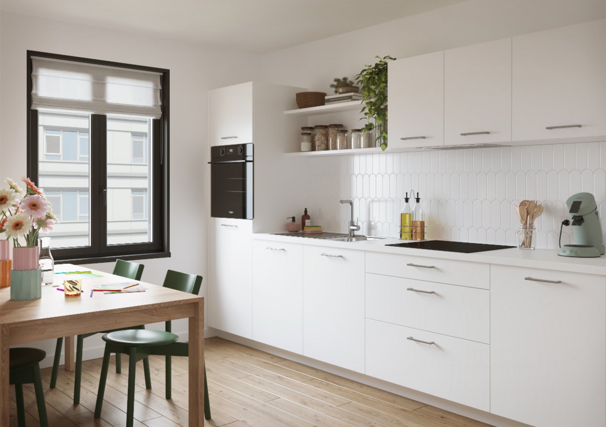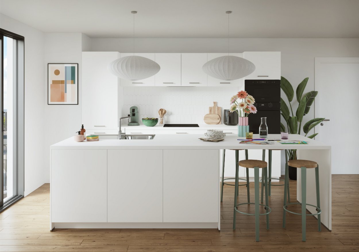Derrière ce blanc alpin éclatant se cache une cuisine qui a tout pour plaire ! L’implantation en U est idéale pour tout avoir à portée de main et faire de la place pour toute la famille. Des électroménagers de qualité pour cuisiner comme tu l’aimes. Et un espace pour manger, faire les devoirs ou refaire le monde…
