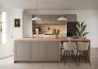 La rencontre du bois du plan de travail et des façades "macchiato" subtilement texturées crée une atmosphère douce et lumineuse, propice au partage et à la convivialité. Les jeux de lumière et les contrastes délicats soulignent la beauté naturelle de l’ensemble.