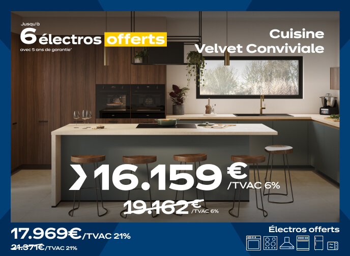 Recevez jusqu'à 6 électros offerts avec 5 ans de garantie à l'achat de votre cuisine équipée.(1)