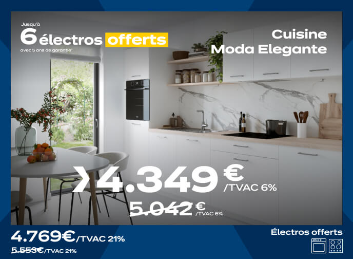 (1) Offre « Jusqu’à 6 électros offerts » - prolongation : valable du 1er au 31/03/2026 pour l’achat d’une cuisine équipée à partir de 2.850€ TVAC de meubles (hors modèle Vita, accessoires, électroménagers, sanitaires, cotisation Recupel, cuisines d’exposition, livraison et pose) livrée et posée par votre magasin ixina en Belgique auprès duquel l’achat est effectué. Jusqu’à 6 électroménagers offerts sur une sélection présentée par votre magasin et dans les conditions suivantes :