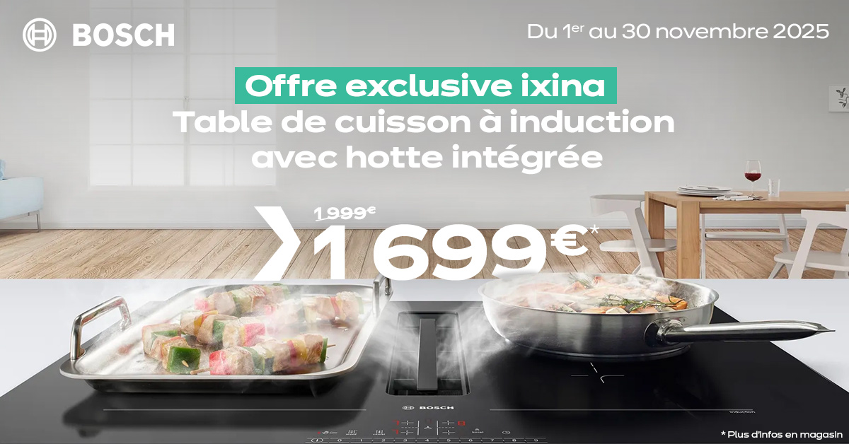 (1) Offre « TVA offerte ou installation offerte » valable du 01/11/2025 au 30/11/2025 pour l’achat d’une cuisine équipée dans un magasin ixina en Belgique. Au choix: (i) « TVA offerte » : pour tout achat d’une cuisine équipée comprenant au minimum 2.500€ TVAC de meubles, votre magasin ixina vous offre sous forme de remise l’équivalent de la TVA à 21%, soit une remise de 17,4% sur la valeur des meubles TVAC de votre achat quelle que soit la TVA applicable à votre achat (6% ou 21%) - OU - (ii) « Installation offerte » : pour tout achat d’une cuisine équipée d’une valeur totale de 2.500€ TVAC minimum (meubles + 4 électroménagers minimum+ sanitaire), votre magasin ixina vous offre l’installation (hors livraison) de votre cuisine. L’offre « Installation offerte » valable uniquement pour un chantier préparé conformément aux conditions communiquées par votre magasin ixina. Offres réservées aux particuliers.