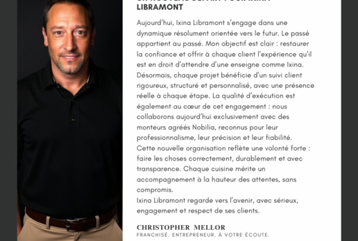 Nos cuisinistes ixina à Libramont sont là pour vous accompagner tout au long de votre projet. Situé au 139, Avenue de Bouillon, notre magasin est ouvert du mardi au samedi, de 10h à 18h. Vous pouvez nous contacter au 061 55 50 56 pour toutes vos questions ou pour prendre un rendez-vous. Nous proposons des devis transparents ajustés à votre budget pour vous offrir le meilleur des conseils en matière de cuisine équipée.