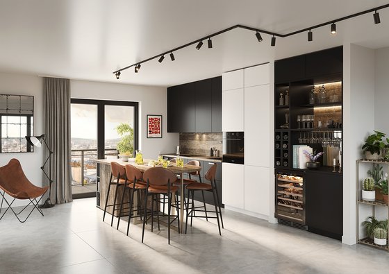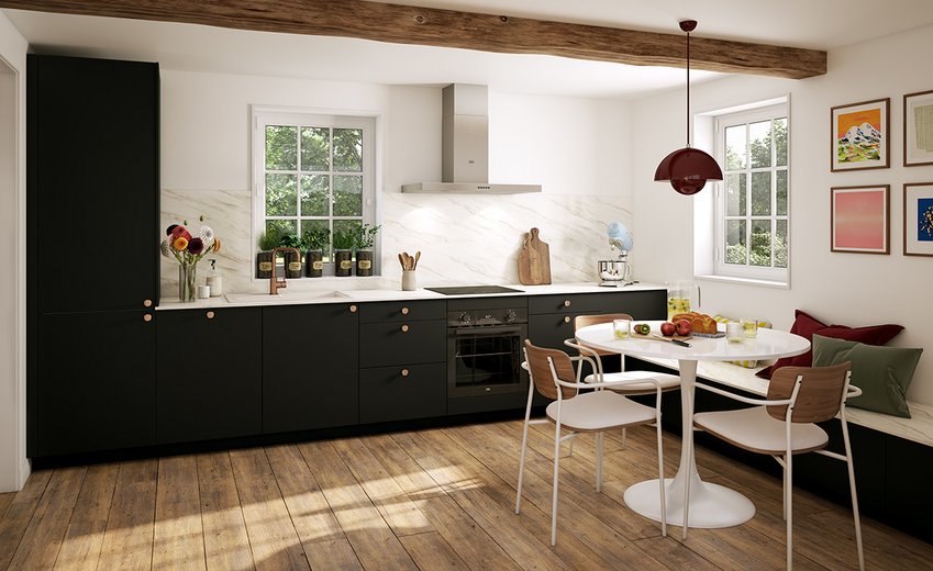 Voor een gedurfde stijl kun je in een overwegend zwarte keuken witte elementen gebruiken om structuur en licht te brengen. Plaats bijvoorbeeld wit op de bovenkasten of het werkblad. Dit is vooral geschikt wanneer de ruimte minder natuurlijk licht krijgt, omdat wit het licht beter weerkaatst.