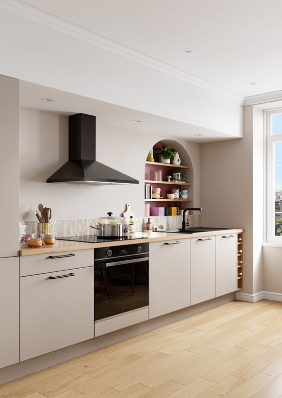 Bahia Cosy, een keuken ontworpen als een echt cocon, waar zachtheid en gezelligheid elkaar elke dag ontmoeten. Deze strakke lijnopstelling verbergt slimme functies: geoptimaliseerde opbergruimte, een vlotte circulatie en elk element dat zijn juiste plek vindt.