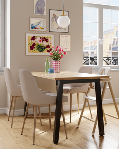 Met zijn lichte houten blad en grafische zwarte poten belichaamt de Bahia Pop-tafel de perfecte balans tussen gezelligheid en moderniteit. Perfect afgestemd op de rest van de keuken, integreert deze tafel zich vanzelfsprekend in de ruimte. Het blad biedt genoeg plek om moeiteloos over te schakelen van ontbijt naar knutselhoek, en van familiediner naar gezellige gesprekken.