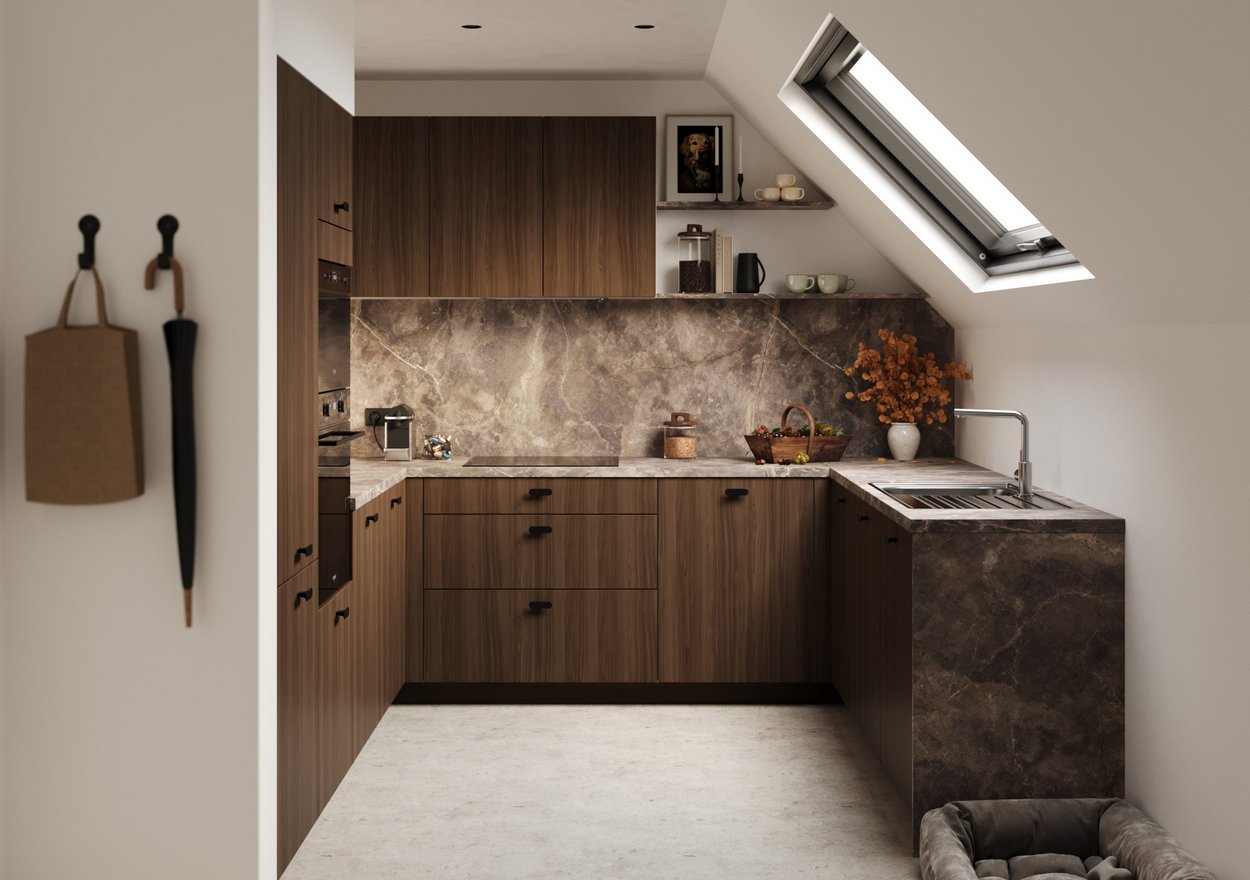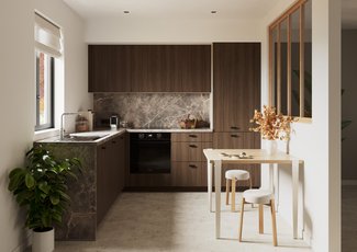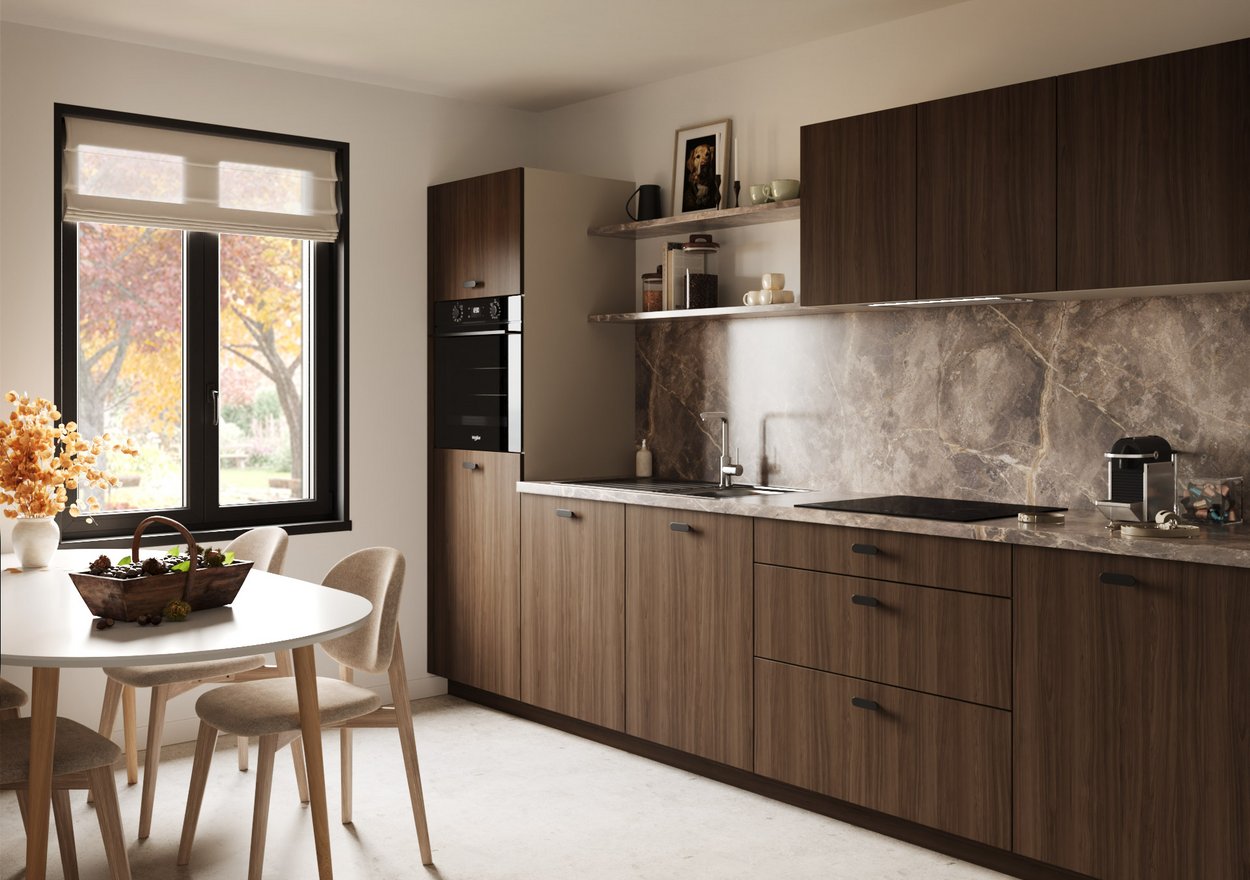 De Linea Elegant belichaamt een subtiele, maar uitgesproken harmonie: een perfect samenspel van finesse, karakter en tijdloze schoonheid. De elegante kaderfronten contrasteren op een natuurlijke manier met de gladde, strak vormgegeven oppervlakken in een verfijnde zandtint. Deze zachte, lichte nuance komt schitterend tot haar recht naast de warme diepte van walnoot en de elegante luxe van een marmerlook werkblad. Het resultaat? Een keuken die tegelijk modern, geraffineerd en uitzonderlijk stijlvol is.