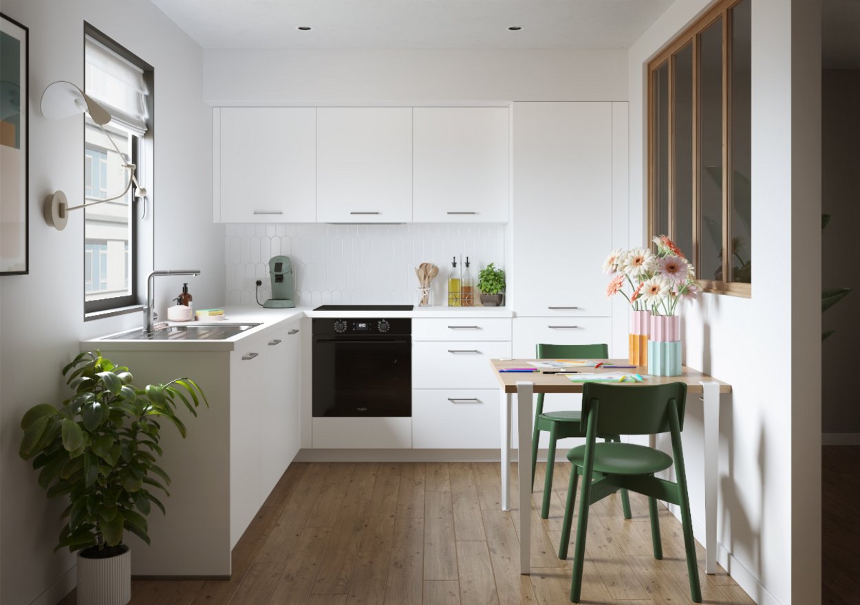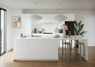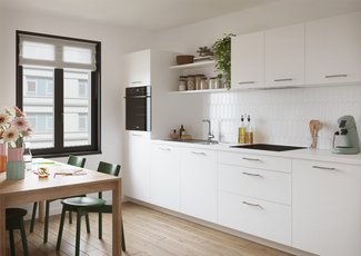 Achter dit stralende alpinewit schuilt een keuken die alles heeft om te bekoren! De U-opstelling is ideaal om alles binnen handbereik te hebben en plaats te maken voor het hele gezin. Kwalitatieve toestellen om te koken zoals jij dat graag doet. En een plek om te eten, huiswerk te maken of de wereld te verbeteren…