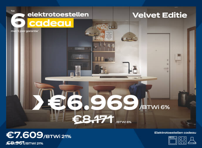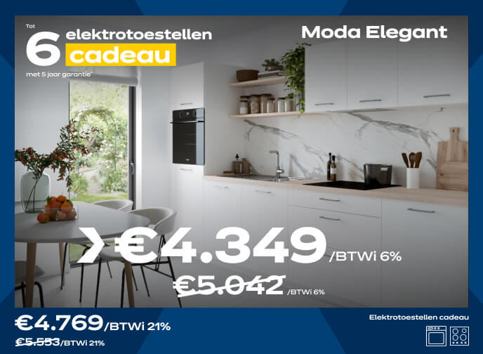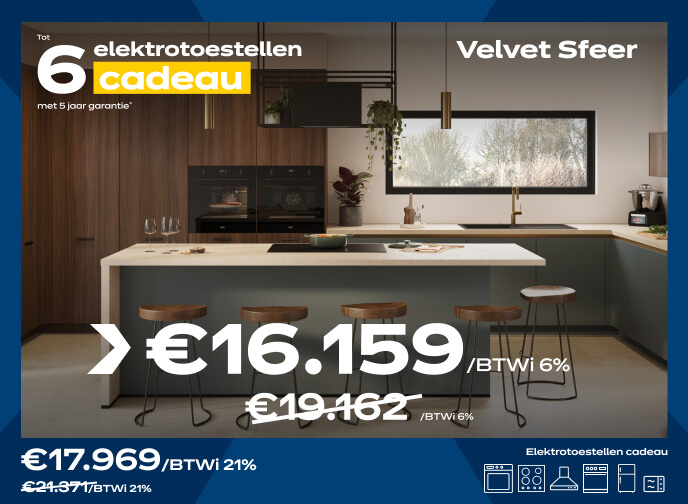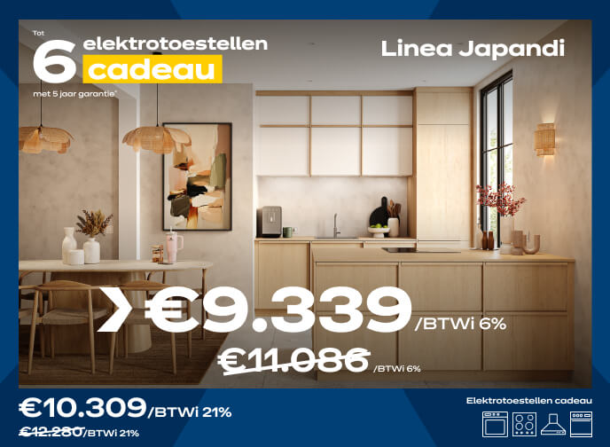 • Bij aankoop van meubilair vanaf € 14.350 incl. BTW: een gratis oven, kookplaat, afzuigkap, vaatwasser, koelkast & magnetron tot een totale waarde van € 2.870.
