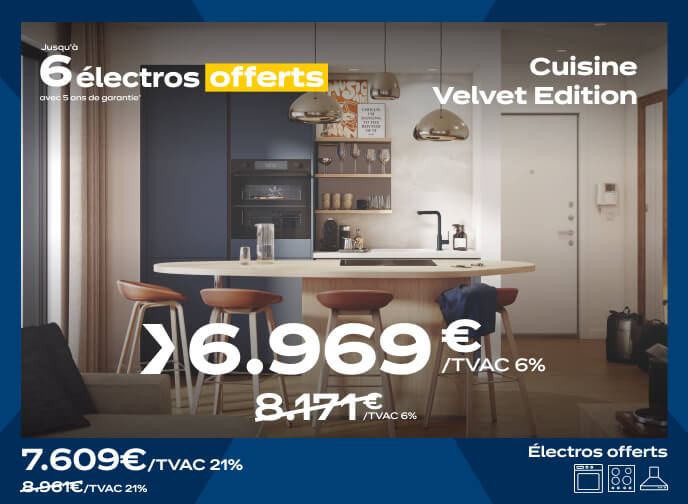 • A partir de 11.500€ TVAC d’achat de meuble : un four, une table de cuisson, une hotte, un lave-vaisselle & un réfrigérateur offerts dans la limite d’une valeur totale de 2.300€ ;