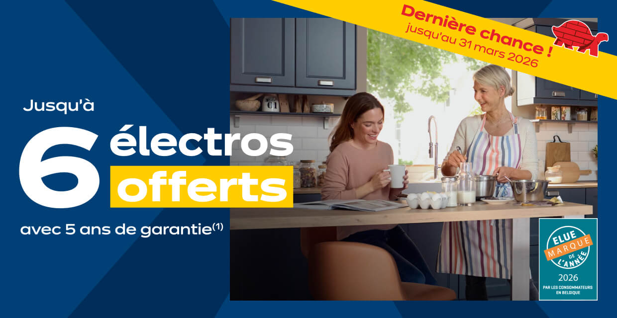 Recevez jusqu'à 6 électros offerts avec 5 ans de garantie à l'achat de votre cuisine équipée.(1)