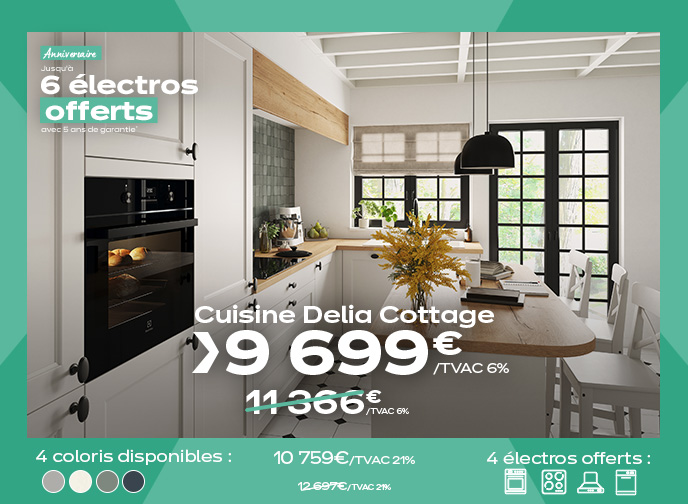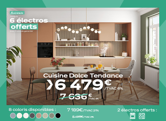 (1) Offre « Jusqu’à 6 électros offerts avec 5 ans de garantie » : prolongée du 1/10/2025 au 31/10/2025 pour l’achat d’une cuisine équipée à partir de 2.850€ TVAC de meubles (hors accessoires, électroménagers, sanitaires, livraison et pose) livrée et posée par votre magasin ixina en Belgique auprès duquel l’achat est effectué. Jusqu’à 6 électroménagers offerts sur une sélection présentée par votre magasin et dans les conditions suivantes :